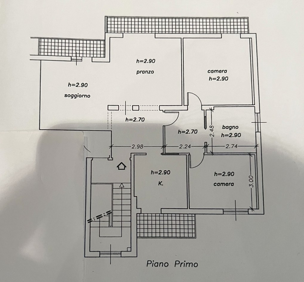 L'appartamento, di circa 110 mq, si sviluppa su un unico livello ed è diviso tra ampio ingresso che conduce al salone doppio (divisibile con un tramezzo per realizzare la terza camera) con due terrazzi, cucina separata ed abitabile anche questa con balcone privato; la zona notte invece si compone di due camere da letto, una matrimoniale e un'ampia singola e un unico grande bagno finestrato ( in origine erano due).