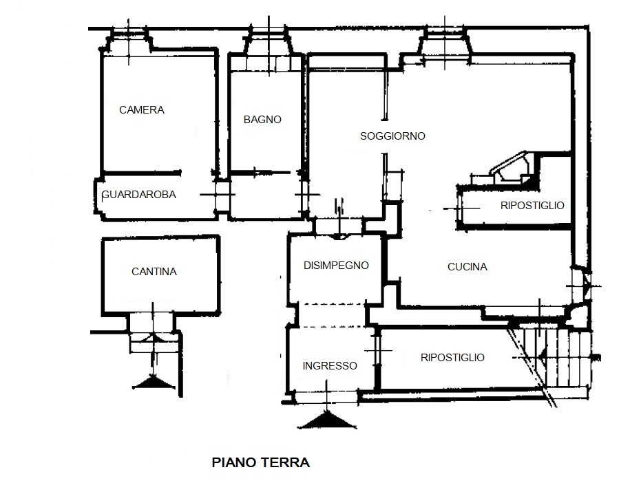 Sviluppa per 75 mq divisi tra ingresso e disimpegno, un primo ampio ripostiglio/lavanderia, soggiorno-pranzo con camino, cucina ed altro ripostiglio, camera matrimoniale e bagno finestrato oltre ad una cantina di 5 mq adiacente all’ingresso. La proprietà comprende un giardino/resede di circa 250 mq distaccato distante 50 metri dall’abitazione.