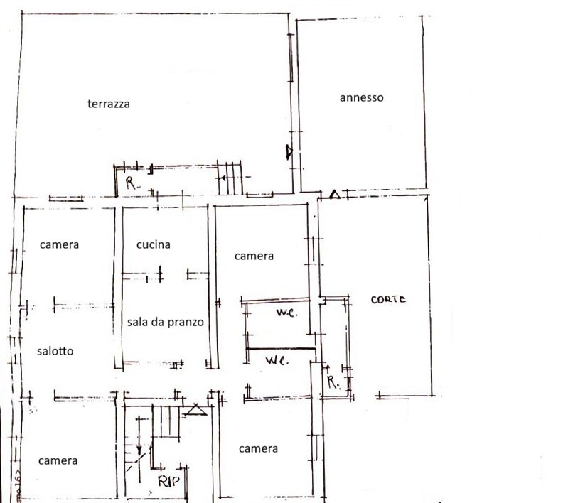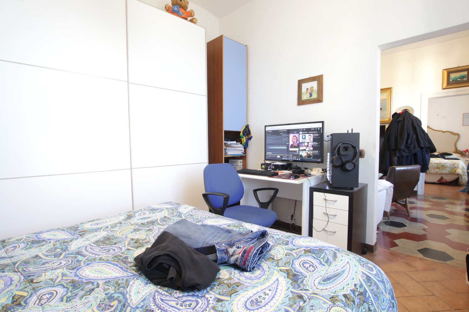 Sviluppa per 130 mq divisi tra ingresso, sala pranzo e cucina con uscita sul grande terrazzo, salotto, quattro camere matrimoniali e due bagni finestrati; da entrambi i bagni si esce su una corte esclusiva e da questa corte e dal terrazzo abitabile si accede ad un annesso di 35 mq adibito a ripostiglio/sgombero (anche soppalcabile) ma destinabile a qualsivoglia utilizzo.